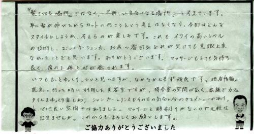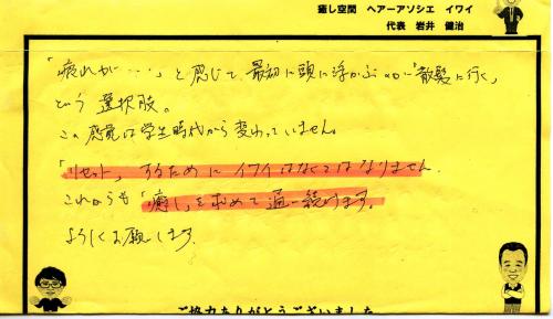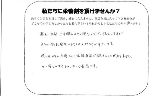 いつもありがとうございます。いつも満足して帰っています。髪を切りにくるつもりが癒しをもとめに来ている感じがします。