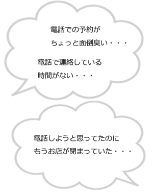 便利なネット予約がおすすめです! ネット予約はとっても簡単!とっても便利! お店の休日や時間帯を気にしなくても、お気軽にご予約いただけるサービスです。 24時間だれでも簡単にネット予約ができます。とっても便利なシステムです。